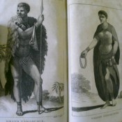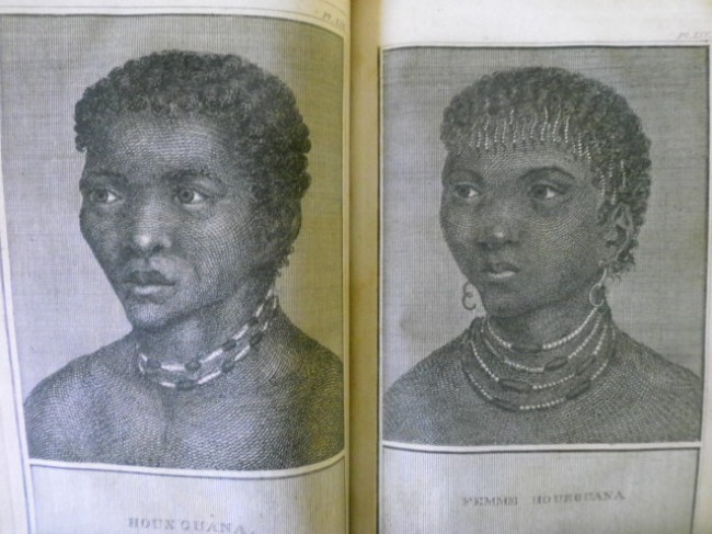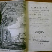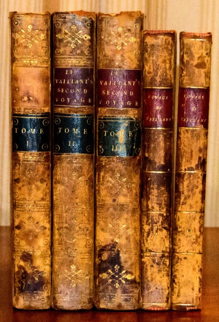The two slim volumes of the first set are a revised outline of all Levaillant's voyages between 1780 and 1785, published in Switzerland in 1790; while the three more substantial volumes of the second set have more detail on the 1783-85 voyages, and were published in France between 1792 and 1793. None of the illustrations appear in both sets.