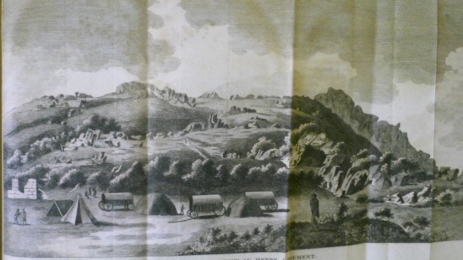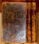 Set B. Second Voyage dans l’Intérieure de l’Afrique par le Cap de Bonne-Espérance dans les années 1783/84/85. The publication year is given as the third year of the Revolution [1792/3]. Full bound in tan calf with gilt lettering on black spine labels. All edges tinted red. Plain endpapers, unmarked. Vol 1 xliv + 304 pp + 1 fold-out map + 5 fold-out and other engravings. Vol 2 426 pp + 8 full-page engravings. Vol 3 iii + 525 pp + 2 pp instruction to binder + 8 full-page engravings.