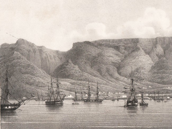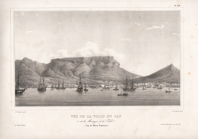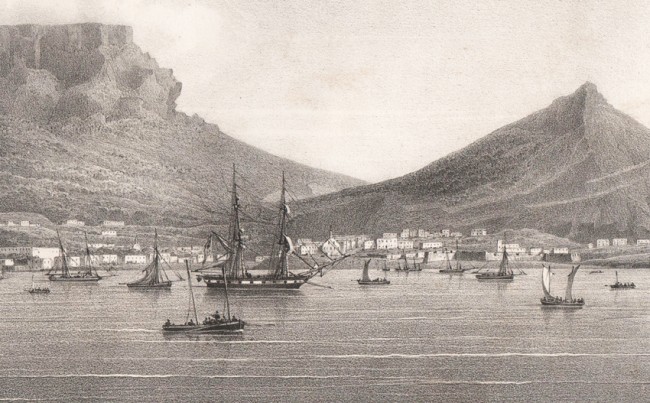 Lithographic view of Cape Town and Table Mountain.