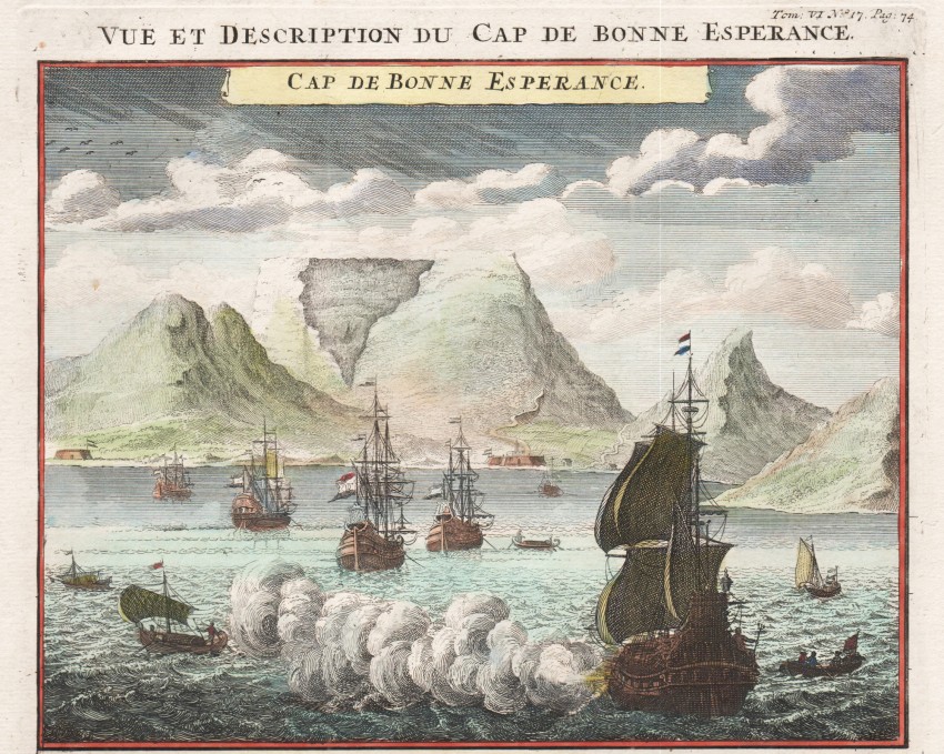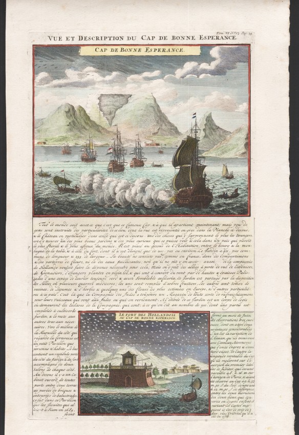 This copperplate engraving is of two views of the Cape. Above is Table Bay, with shipping in the foreground flying the Dutch flag, and separating the two views is an engraved descriptive text which refers mainly to the Company’s gardens, 'the most beautiful and curious to be seen in a country that is sterile and frightful.' The lower engraving shows the Dutch fort at the Cape and an observatory established by the Frenchman Tachard and the Jesuit Fathers to observe the southern skies.
