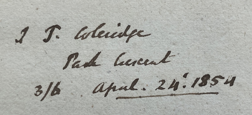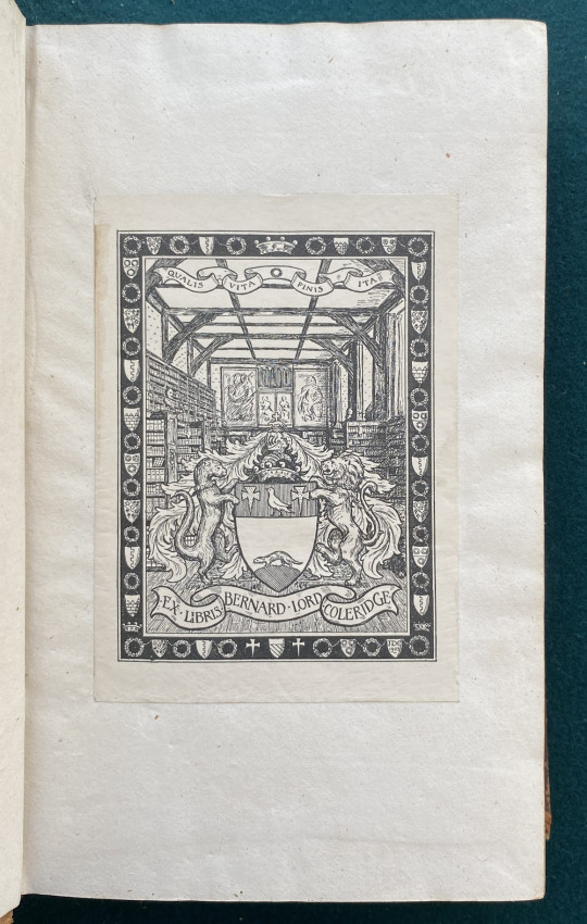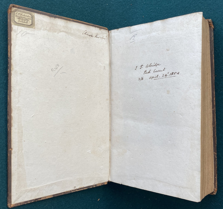 [William Stewart ROSE (1775-1843)]. Letters from the North of Italy. Addressed to Henry Hallam… in two volumes. London: John Murray, 1819. 2 volumes in one volume, octavo (8 ¼ x 5 1/8in; 210 x 130mm). Pp. [i-]vi-xi[-xii], [1-]2-339[-340]; [i-]vii-viii, [1-]2-229[-230], with half titles and errata on final page. Contemporary mottled calf, the flat spine gilt (rubbed, splits to joints). Provenance: Sir John Taylor Coleridge (9 July 1790 – 11 February 1876, inscribed ‘J.T Coleridge / Park Crescent / 3/6 April 24th 1854’, by descent); Bernard, Lord Coleridge (armorial bookplate).