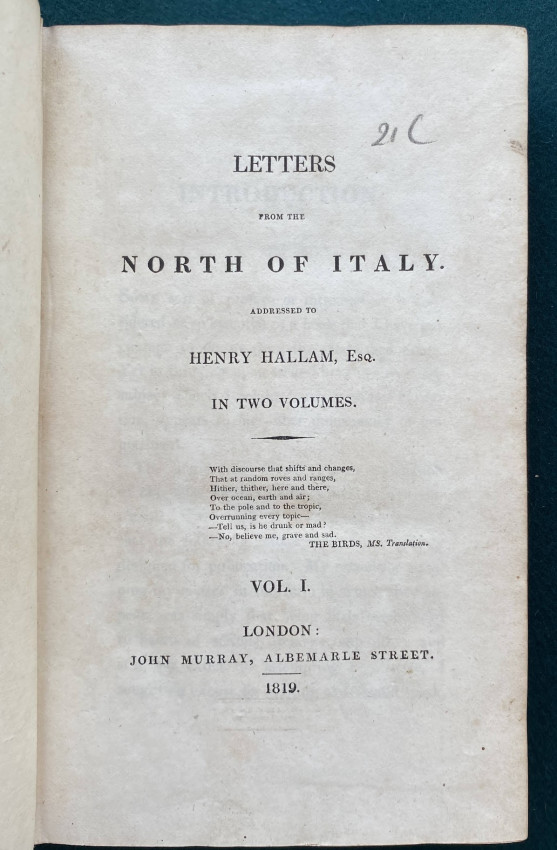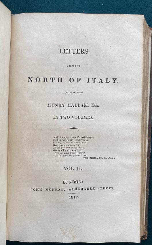 First edition – a nice copy with an interesting provenance. This work made up of ‘discursive letters …addressed to Henry Hallam. They include pro-Napoleon sentiments and mention the satirical poet Giuseppe Parini’ (wikipedia).