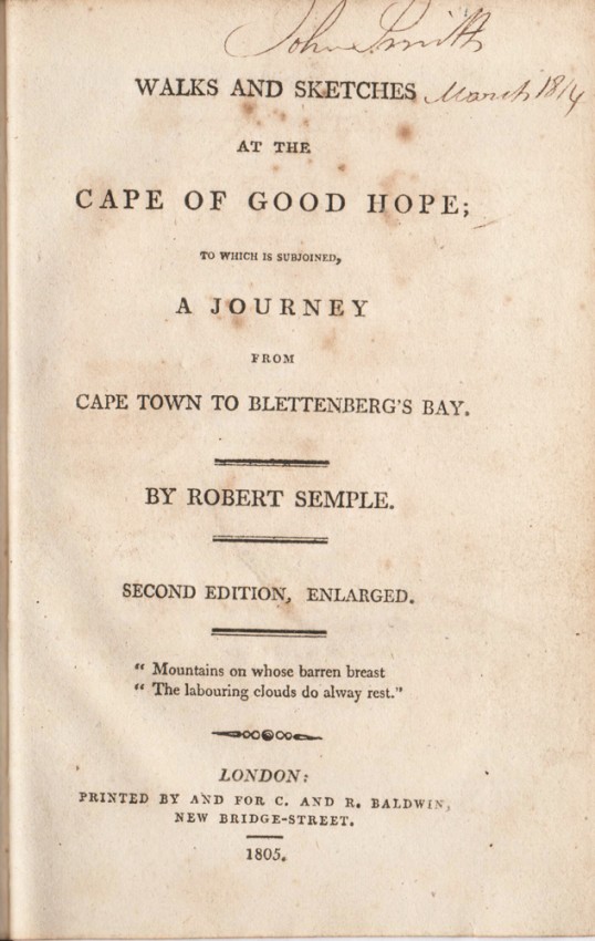 Kennedy (R.F.) Africana Repository, pp. 85-6: ‘Robert Semple walked in the vicinity of Cape Town and as far as Simonstown, carrying on a most informative conversation with his dear friend Charles. In the second edition, I805, he explains who Charles is, in a footnote to p.10: "In presenting to the world a second and enlarged edition of this little work, I embrace the opportunity which it affords me of replying to a question which my friends have repeatedly asked. 'Who was Charles of whom you talk with so much warmth, and who is so constantly the companion of your walks?' To this I reply that in fact no friend ever accompanied me in the excursions which I have particularly described. I thrice ascended the Table Mountain alone; alone I stood upon its highest pinnacle; alone I looked up to heaven, and felt my heart overflow with gratitude. Yet the idea of a friend who is now dead was ever present with me, and I conceived myself perfectly at liberty to embody what I know would have been his thoughts, and his mode of expression had he indeed accompanied me. Such was the origin of Charles."'The journey to Plettenberg Bay was made on horseback and one of his companions was a brother merchant of the Cape.