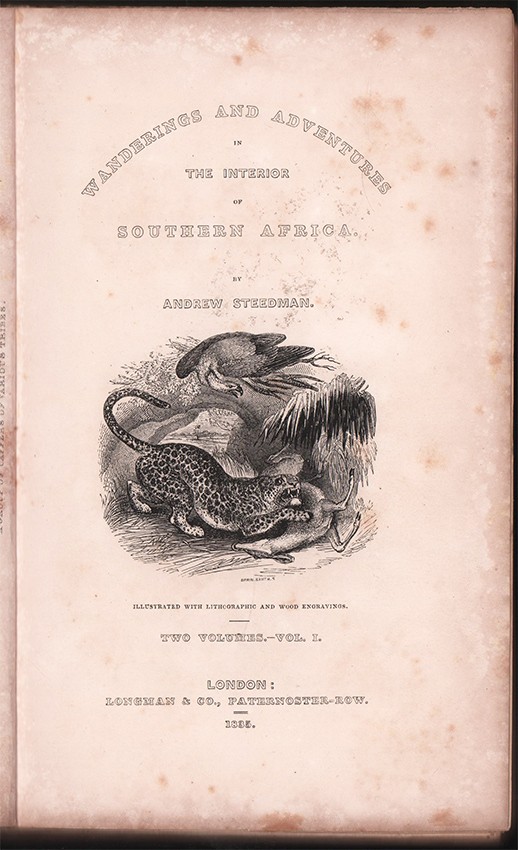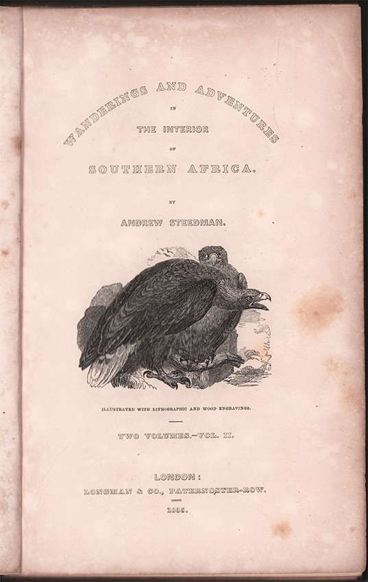 Dictionary of South African Biography vol. II page 706. 'Steedman made three major expeditions and amassed a large number of natural history specimens. In 1834 he set up an exhibition in England and in so doing aroused such great interest that he also published "Wanderings and Adventures in the Interior of Southern Africa'.