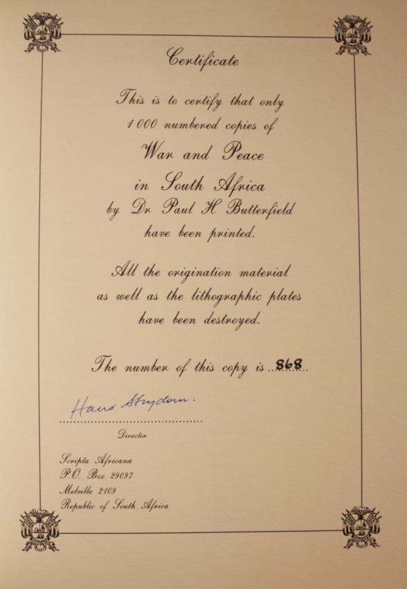 First edition published by Scripta Africana, 1986. One of 1000 numbered copies. Signed on the limitation page as well as after the foreword by Hans Strydom, the director and chairman of Scripta Africana.