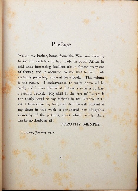 Mortimer Menpes made these sketches as a Special Correspondent for BLACK AND WHITE during the Boer War; his daughter, Dorothy transcribed his descriptions of the incidents depicted. A series of facsimile autograph letters is appended.