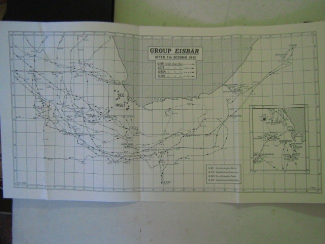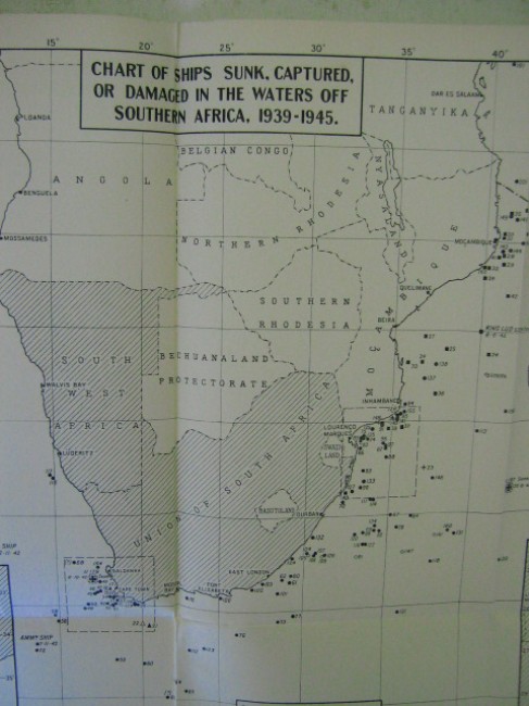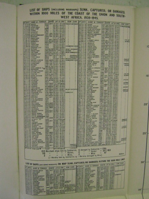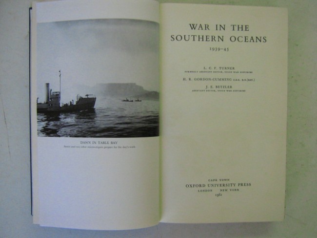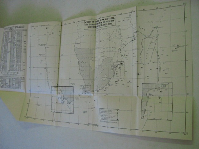 Scarce and incredibly detailed record of one of the lesser known arenas of naval conflict in WW2, most of which provides information on the defence of the South African coastline, and the operations carried out there, including the monitoring of German U-Boats, Gruppe Seehund, Gruppe Eisbär, Graf Spee, S.A.A.F operations, the Agulhas minefield, ships calling at Durban and Cape Town, as well as a comprehensive list of ships sunk, details of Indian Ocean traffic, and with multiple detailed fold-out maps, charts and references for period 1939-43. Book Condition: Very Good. First Edition. 8vo. blue boards, 288pp, 42 maps and charts, 36pp b&w photos, title on spine in gilt, some browning to end-papers, previous owner\'s name on f.f.e.p., a clean unmarked and tight copy.