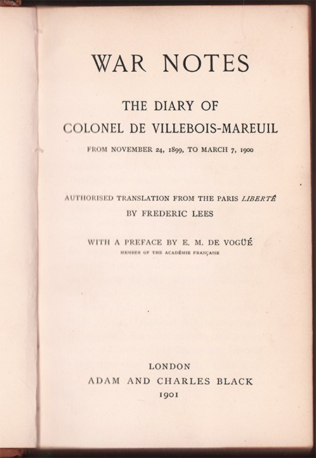 Mendelssohn (Sidney) SOUTH AFRICAN BIBLIOGRAPHY volume 1 page 569:Villebois seems to have been thoroughly disillusioned before he lost his life at Boshof ; a brave and skilful soldier, he appears to have been disgusted with the procrastination of the Boers, and their want of decision, resolution, and union. He thought well of the abilities of De La Rey, but considered that Joubert was a mere politician. He seems to have had a great contempt for the British army and officers before the arrival of Lords Roberts and Kitchener, but speaks of the presumption of the Republicans in thinking that they would defeat these generals as easily as they did some of the previous leaders. He criticises Buller's operations, but continually draws attention to the very marked " carefulness " of the burghers, of whom he says, " The Boer's first concern is for his safety."