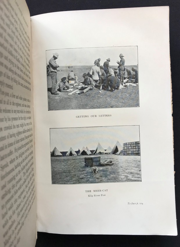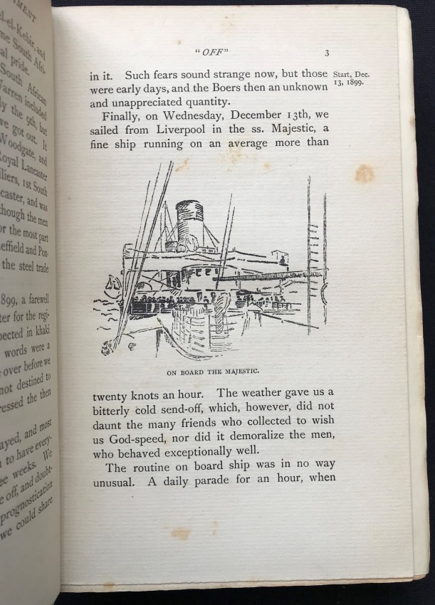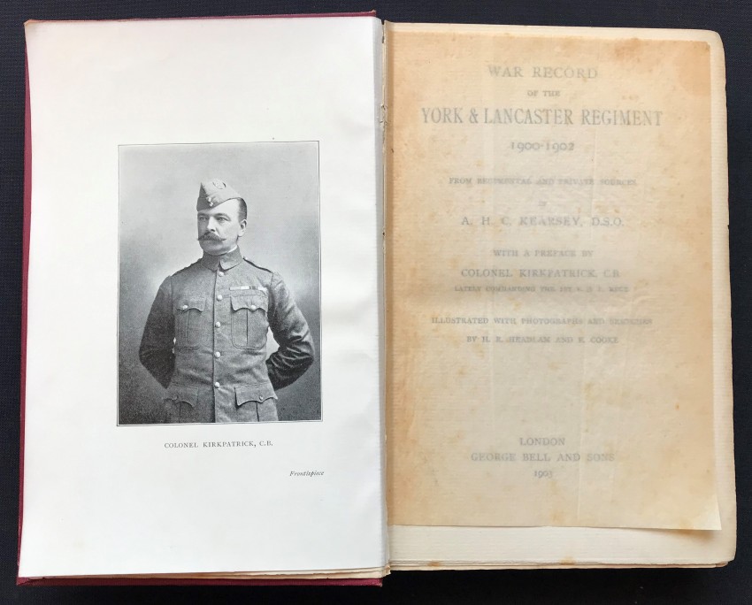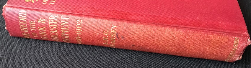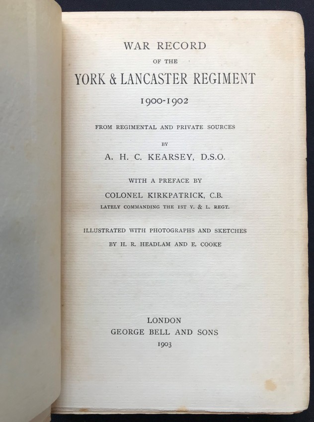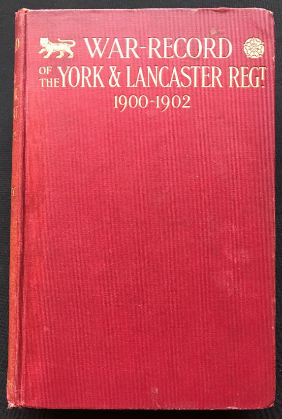 A regimental history of the York & Lancaster Regiment during the Boer War. 1903. Offsetting on the front/back endpapers, foxing can be seen throughout. Overall, the book and the binding are in good condition.