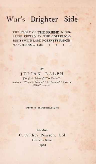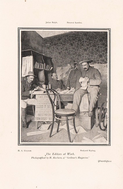 Mendelssohn Sidney South African Bibliography. volume 2, pages 197-8, 'An account of the publication of a paper issued in Bloemfontein, under the auspices of the military authorities, and edited by Messrs. Julian Ralph, Landon, Gwynne and Rudyard Kipling. Twenty-seven numbers were published, after which the paper was taken over by the staff of the Johannesburg Star. Contributions were made to the journal by several celebrated authors (including Conan Doyle), artists and journalists, and Mr Ralph observes, "in all the wealth of English literature, I know of no such mirror-reflecting and phonograph-echoing of soldier life as is here"'.