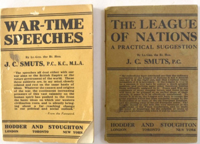 First editions in the original wrappers of these two fairly uncommon Smuts booklets. War-Time Speeches is 127pp. in the original beige wrappers which have some small fishmothing holes and a 2x3cm. chip off the lower front corner. The League of Nations is 71pp. in the original brown wrappers which are lightly worn but about very good.