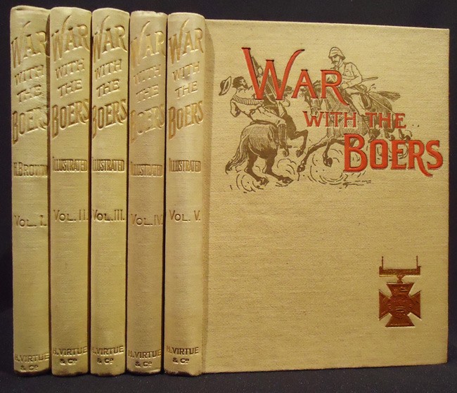5 volumes, 248 pages each volume, 12 maps, frontispiece portrait in each volume, 20 photogravure portraits, 20 tinted plates and many black & white text illustrations, pictorial khaki cloth, all edges gilt, an unusually good set.