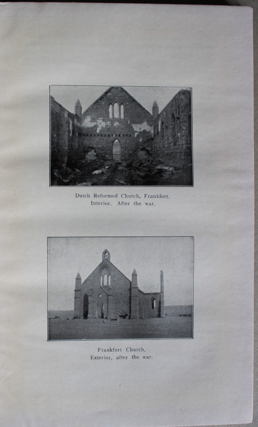 Photo pictures of Dutch Reformed Frankfort Church, O.F.S. before the war and after the war. Also of the Reitz Dutch Reformed Church. And of exiled prisoners driven to Pietermatitzburg Camp.