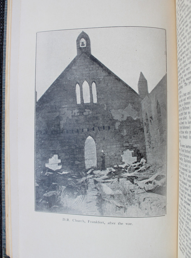 Photo pictures of Dutch Reformed Frankfort Church, O.F.S. before the war and after the war. Also of the Reitz Dutch Reformed Church. And of exiled prisoners driven to Pietermatitzburg Camp.