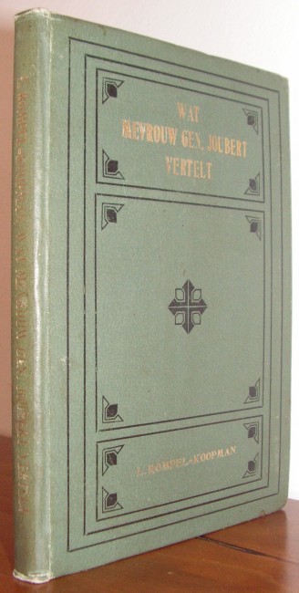 Crown 8vo; original green cloth blocked in black and gilt on upper board, and lettered in gilt on spine; pp. 96; plates. Light wear to cloth; pages a little browned. Very good condition. Dutch text. "Hardened by the privations and misfortunes of the Trek, [Hendrina Susanna Johanna Joubert] was tough, intrepid, and fearless. Stories about her courage and perseverance have become almost legendary. During the Transvaal annexation period, for example, she crossed the Vaal River in full spate, with a waggon loaded with rifles which her husband had obtained when the deputation visited Europe, so preventing the arms from falling into British hands. In times of adversity it was she who encouraged and inspired General Joubert to carry on. Until the end of her eventful life Hendrina Joubert retained a slim elegance, an upright and proud figure, and an aristocratic bearing. Despite her stern looks she was a gentle person at heart. … Her memoirs, compiled by Mrs. M. L. Rompel-Koopman, appeared under the title 'Wat mevrouw generaal Joubert vertelt' in 1915, and are an invaluable cultural-historical document. In it she recounts how the children were taught while on trek, and talks about the clothing worn, home industries, and the illnesses and disasters that befell them all during the Trek." - DSAB V, pp. 395-6