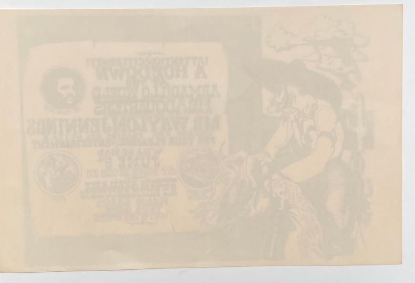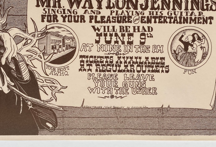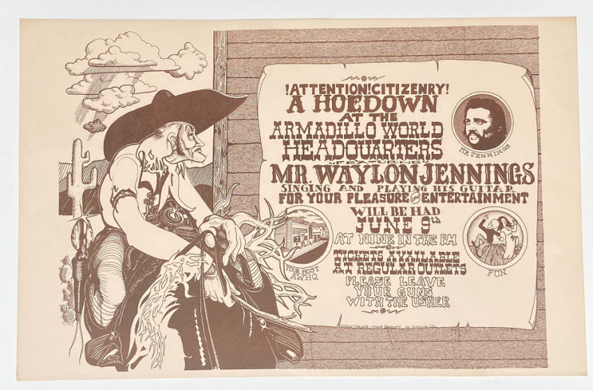 “Attention Citizenry / A Hoedown / at the / Armadillo World / Headquarters / Mr. Waylon Jennings / singing and playing his guitar / …. / June 9th / …. / Please leave / your guns / with the Usher” [Austin: 1973]. Offset litho. dark brown on off-white poster (11 1/8 x 17 1/4in; 282 x 438mm). Provenance: the artist’s own collection.