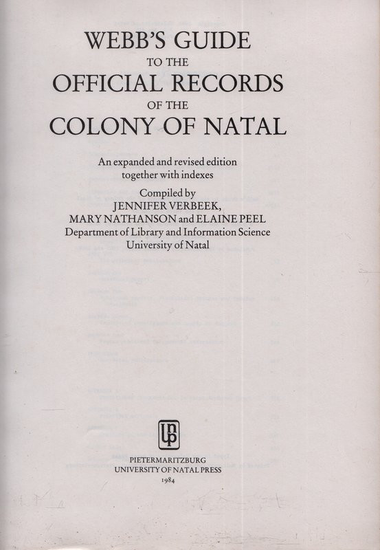 This final revised edition lists the Natal colonial holdings of the South African Archives and other important South African libraries, this in addition to that held in five major Natal collections. A generally unobtainable reference work being a continuation of "A Guide To The Official Records Of Natal" originally compiled by C. de B. Webb in 1965 & 1968.