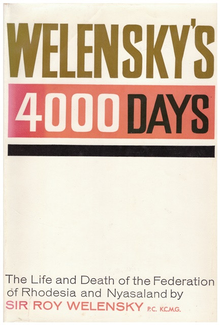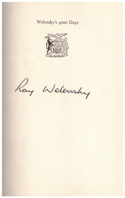 383 pages: portraits (1 as frontispiece), map on endpapers. Paper covered boards, dust wrapper. Signed by Welensky on the half-title page.