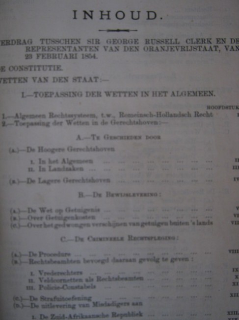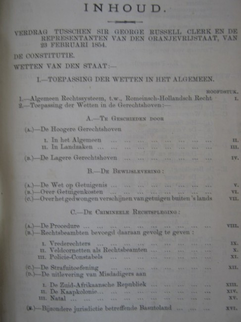 After the contents and other preliminary pages (pp i-viii), the book begins with the 23 February 1854 Treaty between Sir George Russell Clerk, Her Majesty\'s Special Commissioner, and representatives of the Orange Free State (pp 1-7). Next are the nine chapters of the Constitution (pp 9-17), followed by the bulk of the book, the Laws (Statutes), arranged in 146 chapters (pp 19-824), and an Appendix containing the Convention of Aliwal and 12 Treaties and Allied Agreements with and involving various other States (pp 825-876). Then follows the index (i-xl). In all, therefore, the volume comprises 924 pp.