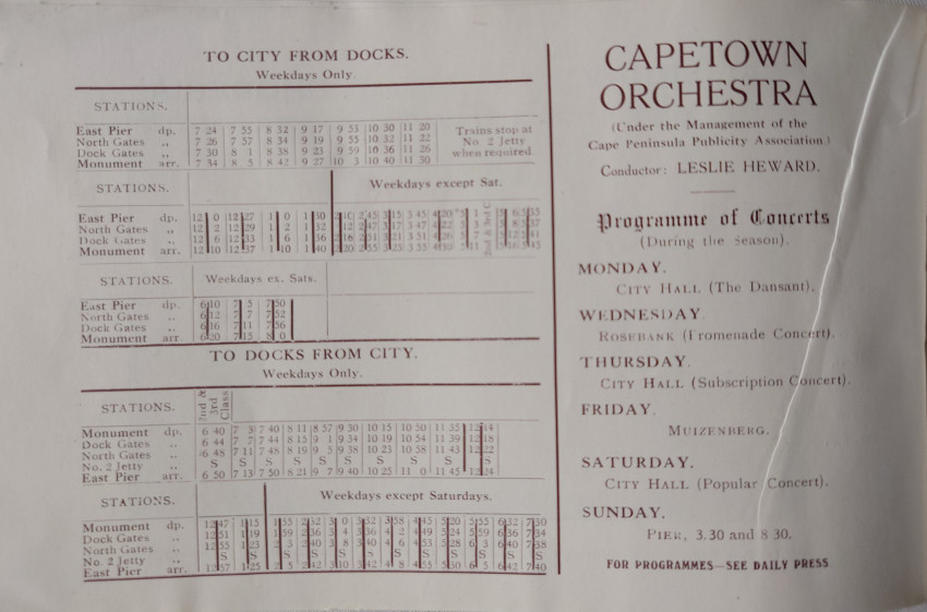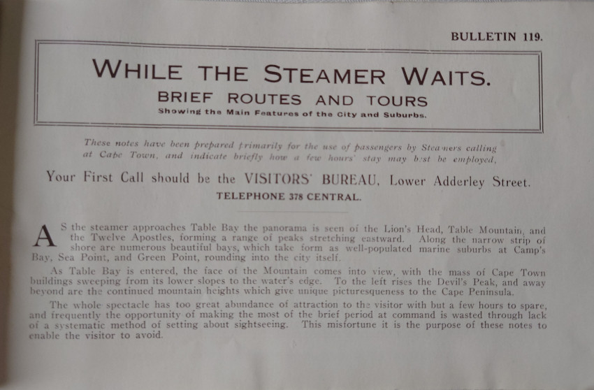 Notes For Rapid Sight Seeing During a Few Hours Visit to Cape Town Published by the Cape Peninsula Publicity Association (CPPA) Undated Believed Circa 1920's Features a fold out panoramic view of Cape Town and the surrounding area. Packed with local period adverts along with suggested activities for tourists with only a few hours to spend in Cape Town.