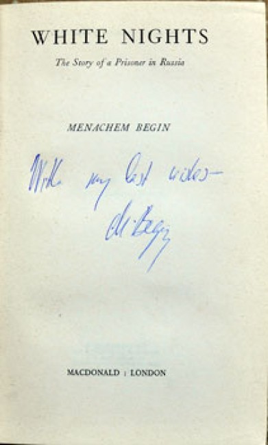First edition of the first English translation of Israeli prime minister Begin's memoirs of his time in a Russian prison. Signed on the title page "With my best wishes - M. Begin". Original black cloth in nice condition but lacking the dw.