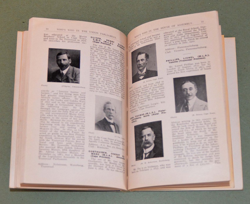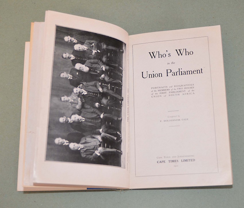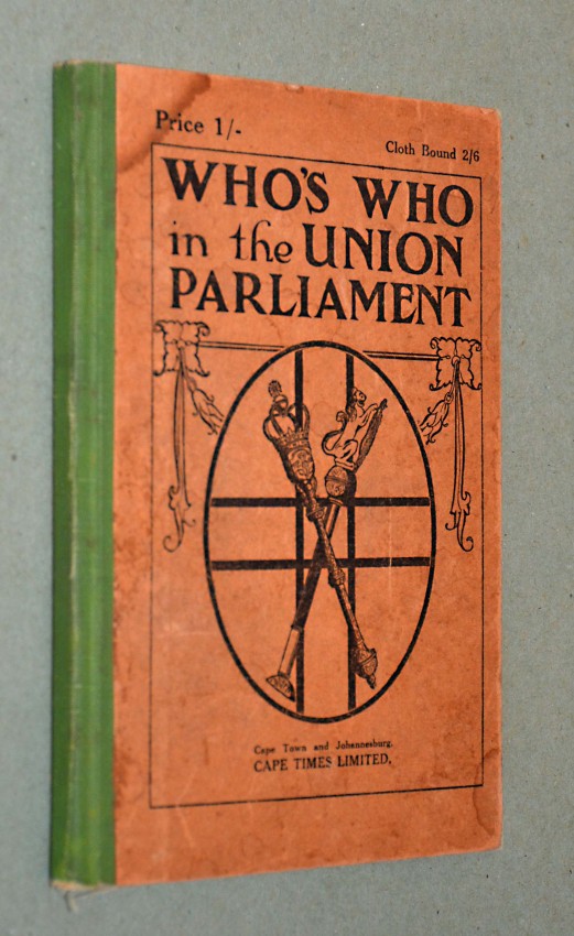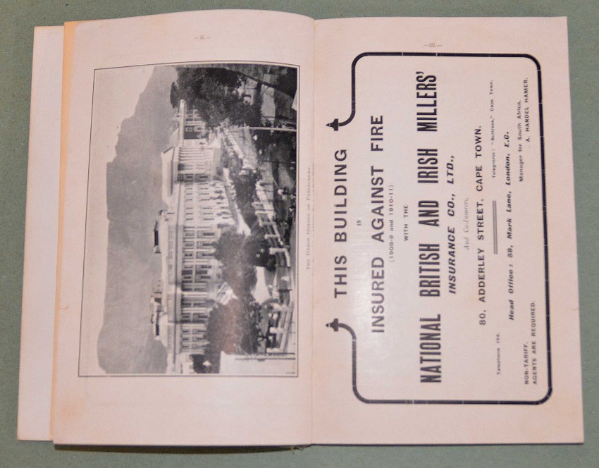 96pp. plus 20pp. prelims and nice period advertisements. A very scarce publication in the original brown cloth backed decorated boards. Contains photographs and resumes of all the members of the new Union Parliament as well as many excellent photographs of the Parliament building.