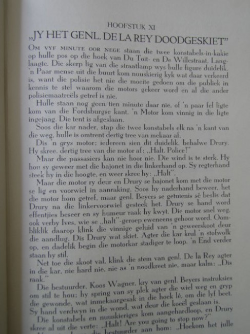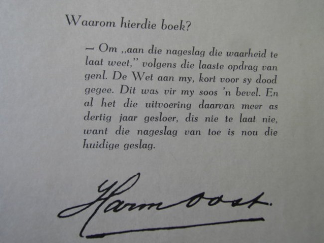 In September of 1956, the author wrote (translated): "Why this book? - 'In order that the next generation should know the truth.' This was the last task General de Wet set for me shortly before his death. I took it as an order and although it has taken me more than thirty years to obey that order, it is not too late, for what was then the next generation is now the present generation."
