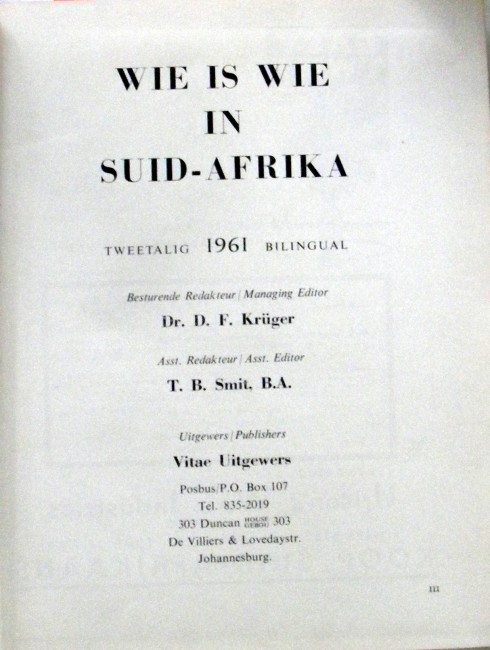 Vitae, Africaans/English parallel text, extensive photographs of listed persons, also full page period advertisement with photographs, bookmarks, 679 pages, 200 x 250mm. Condition: very good.