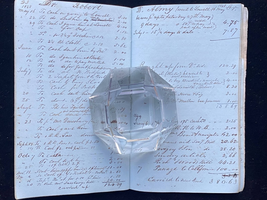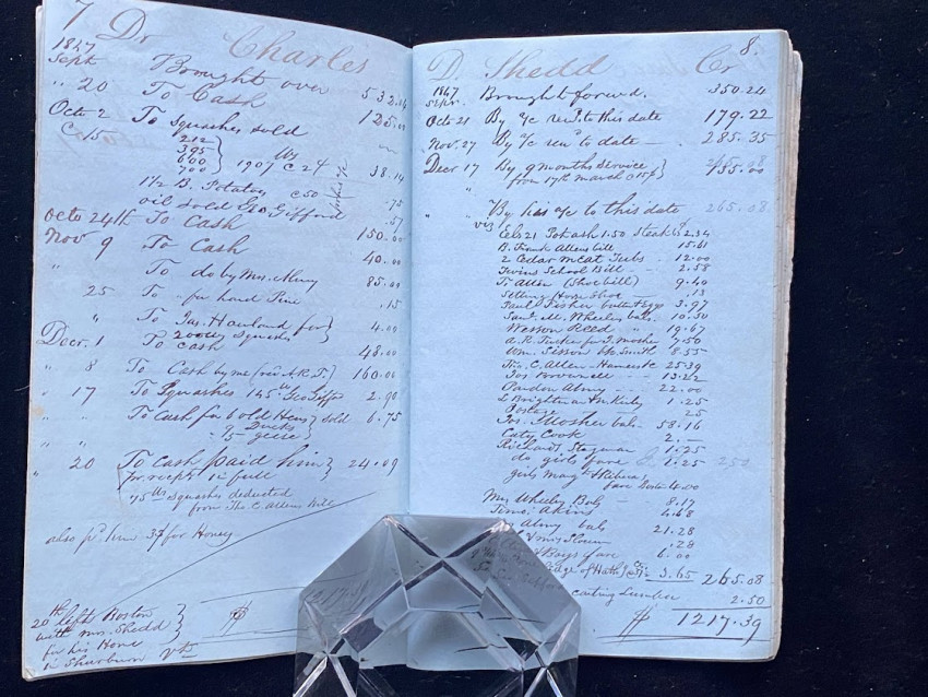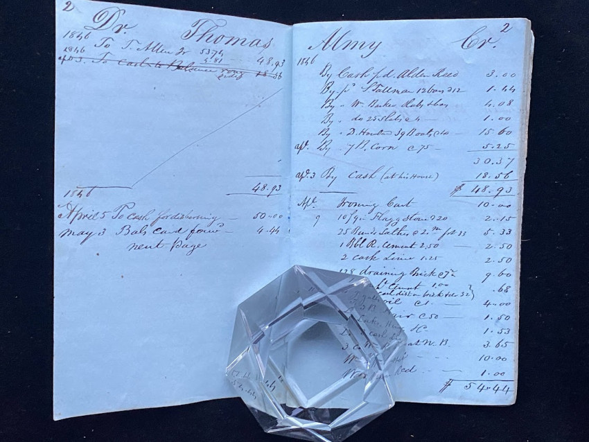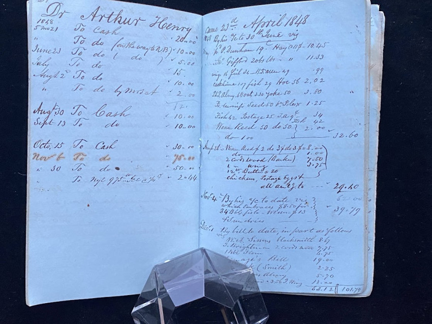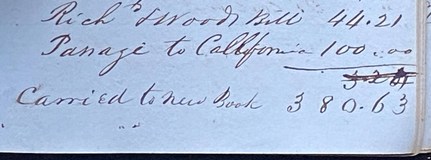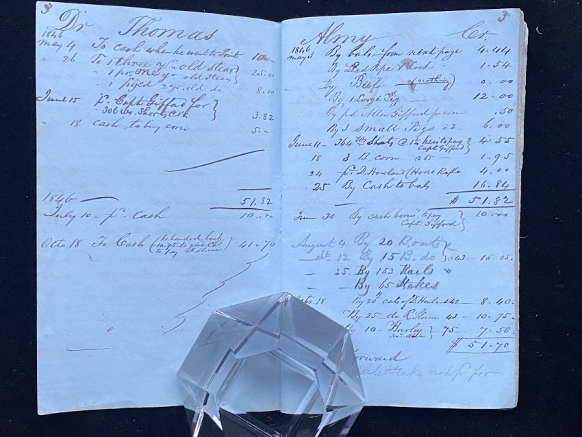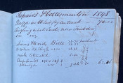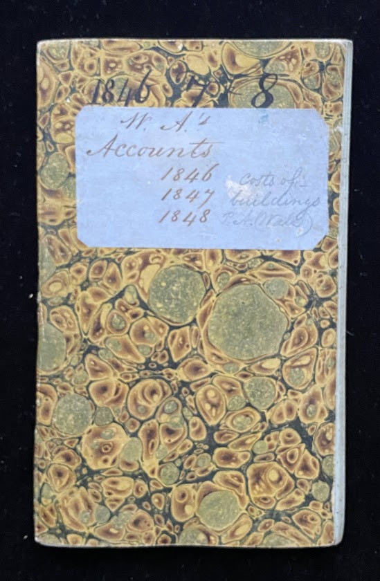 William ALMY (1798-1881, landowner & compilor), of Massachusetts. [A pocket accounts book, titled on the upper cover:] ‘W.A.’s / Accounts / 1846 / 1847 / 1848’ [and including some ‘historic’ accounts back to 1844]. 12mo (6 ¾ x 4 inches; 172 x 102 mm). 72 pp. of entries detailing payments to individuals, including paying $100 for his eldest son, Robert Brayton Almy (1831-1896) to go to California [paid 7. Feb. 1849]); other family members mentioned include Pardon Almy, Thomas Almy, Oliver Almy. Non-family members include businessmen, craftsmen, farm workers and domestic workers. Also included, are details of the work done on the farm house and farm buildings, and the cost of seasonal tasks, like filling the ice-house. Marbled wrappers, paper label on the upper cover.