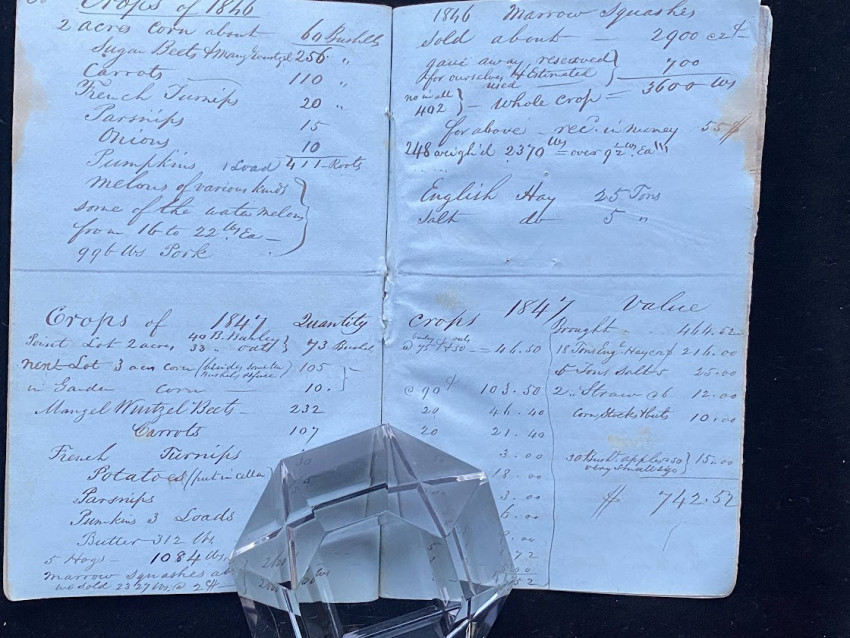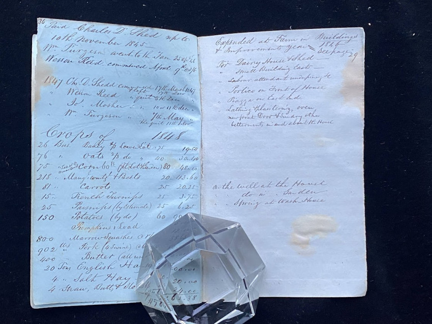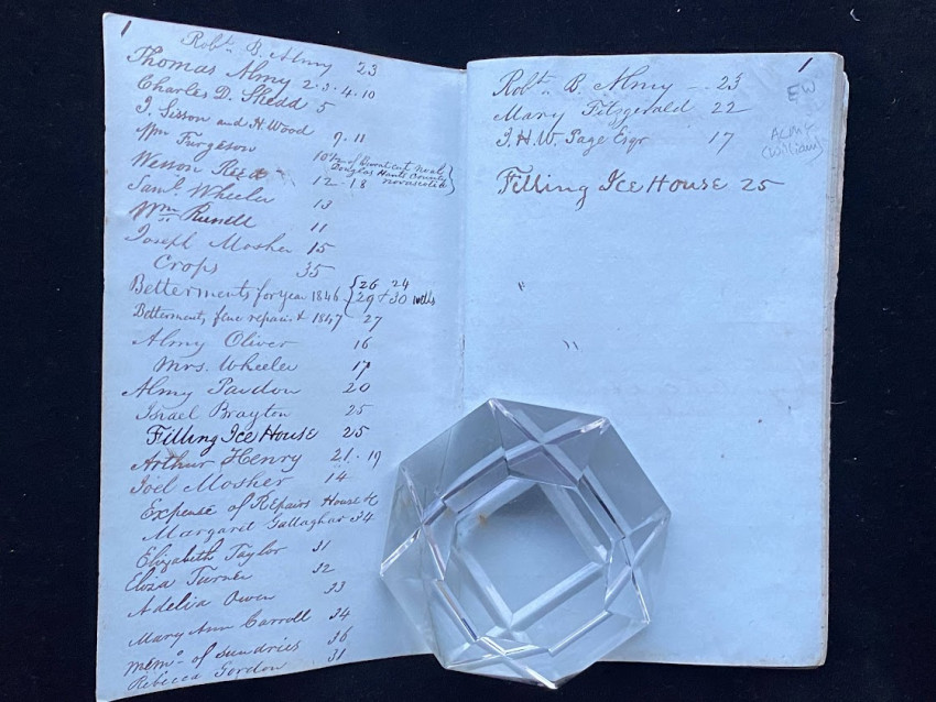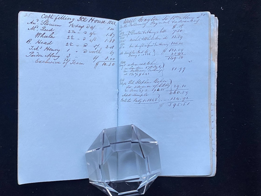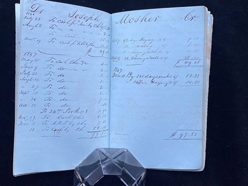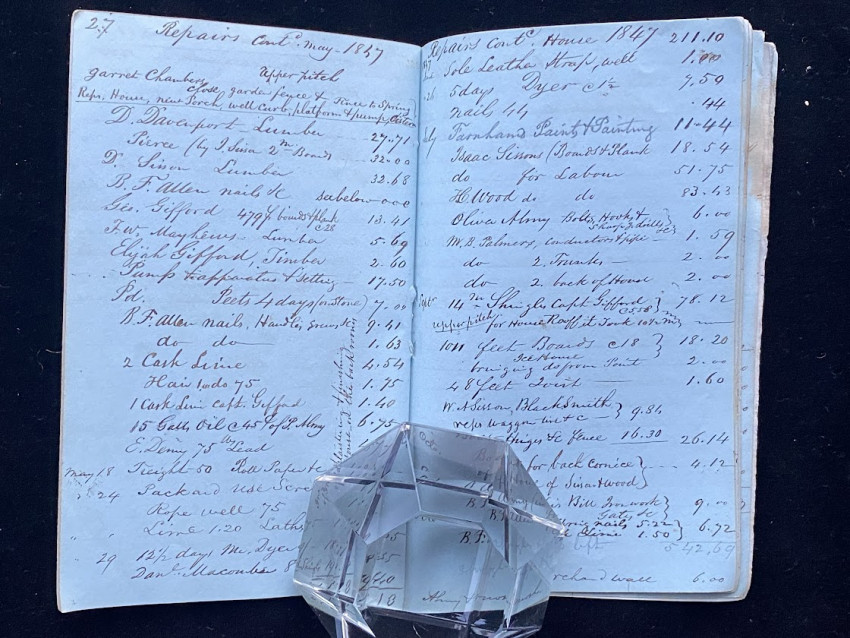 William ALMY (1798-1881, landowner & compilor), of Massachusetts. [A pocket accounts book, titled on the upper cover:] ‘W.A.’s / Accounts / 1846 / 1847 / 1848’ [and including some ‘historic’ accounts back to 1844]. 12mo (6 ¾ x 4 inches; 172 x 102 mm). 72 pp. of entries detailing payments to individuals, including paying $100 for his eldest son, Robert Brayton Almy (1831-1896) to go to California [paid 7. Feb. 1849]); other family members mentioned include Pardon Almy, Thomas Almy, Oliver Almy. Non-family members include businessmen, craftsmen, farm workers and domestic workers. Also included, are details of the work done on the farm house and farm buildings, and the cost of seasonal tasks, like filling the ice-house. Marbled wrappers, paper label on the upper cover.