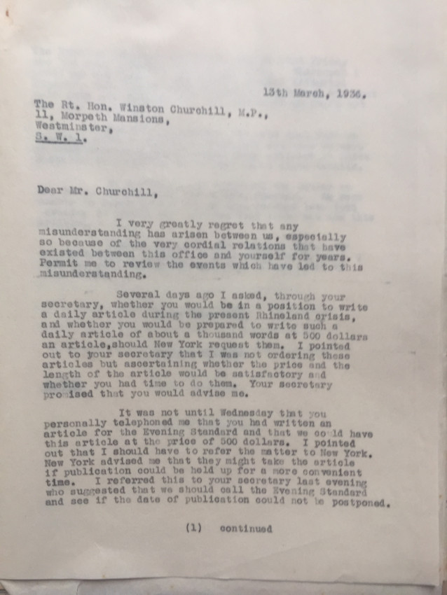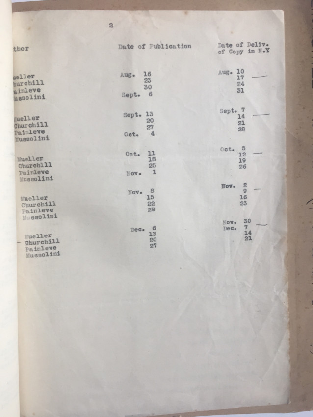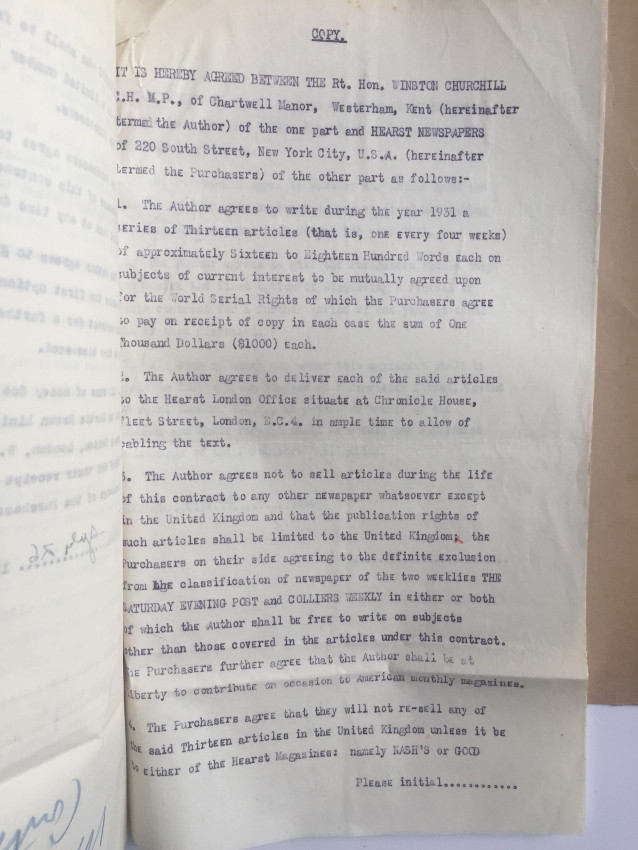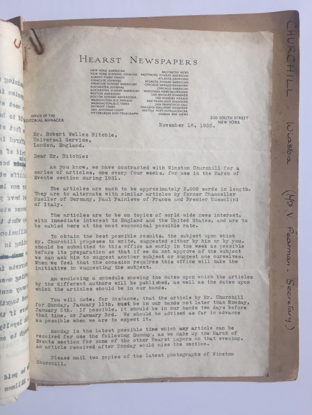 “As you know, we have contracted with Winston Churchill for a series of articles, one every four weeks, for use in the March of Events section during 1931. The articles are each to be approximately 2,000 words in length. They are to alternate with similar articles by former Chancellor Mueller of Germany, Paul Painleve of France and Premier Mussolini of Italy. The articles are to be on topics of world wide news interest, with immediate interest to England and the United States, and are to be cabled here at the most economical possible rate. To obtain the best possible results, the subject upon which Mr. Churchill proposes to write, suggested either by him or by you, should be submitted to this office as early in the week as possible before its preparation so that if we do not approve of the subject can ask him to suggest another subject or suggest one ourselves when we feel that the occasion requires this office will take the initiative in suggesting the subject.”