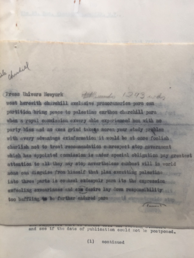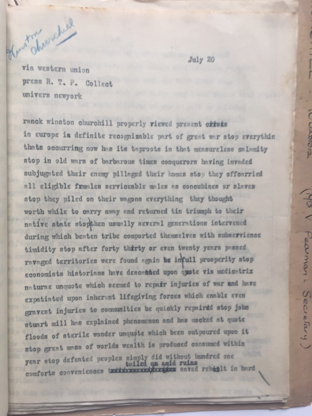- An 8-page typed copy of an article sent via Western Union, presumably the first draft by Churchill, dated July 20 [1931] (typed using a Hearst Office typewriter, with an ingenious way of ensuring the authenticity of the document: the document has an ever-present capital 'E' instead of the regular lowercase 'e').