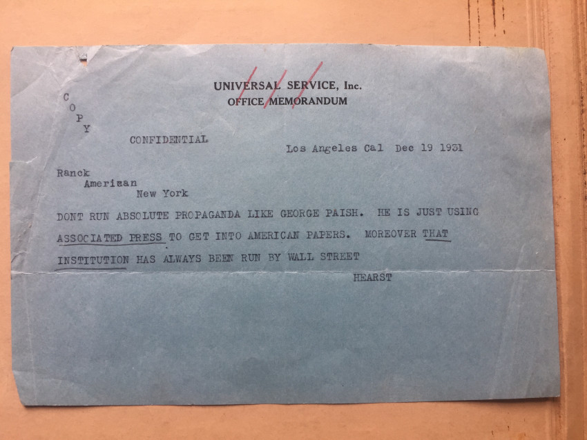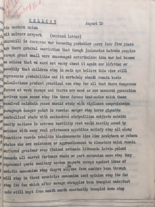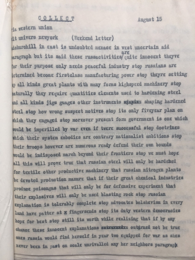 - a 6-page (Hearst Offfice Typed) copy of article sent via Western Union, on Russia, Bolshevism and relations with the West , dated August 15 [1931].