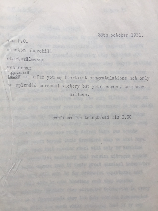 - a 1-page copy of Hillman's letter to WSC, congratulating him for his victory, dated Oct. 28, 1931