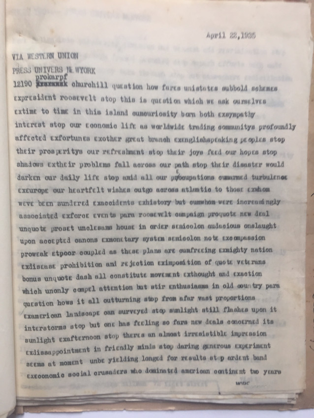 - 5-pages (Hearst Offfice Typed) copy of article sent via Western Union, on "How fares the United States under the bold schemes of President Roosevelt?" (see lot #14) dated April 22 1935