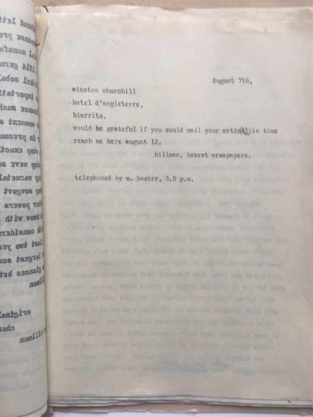 - a 6-page transcription of a phone call to WSC, a reminder to submit his articles on time, dated Aug. 7 [1931]
