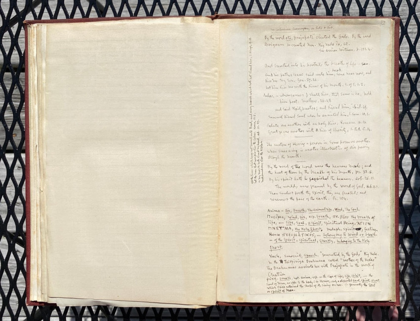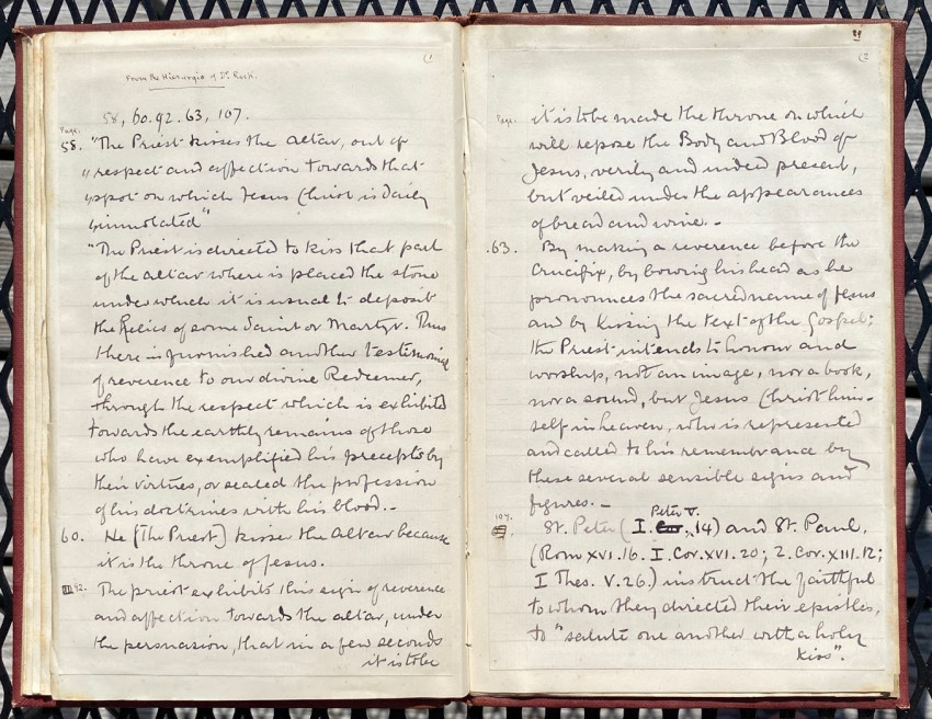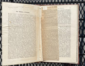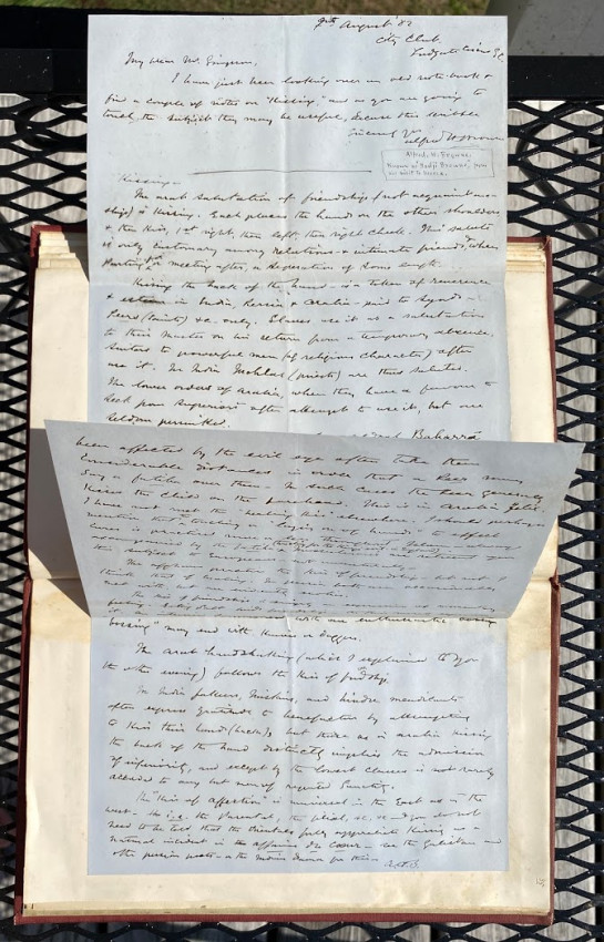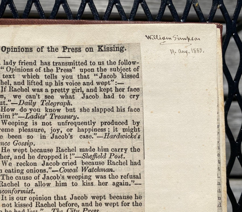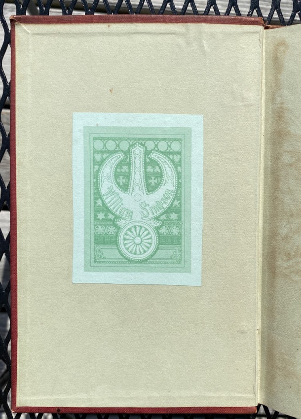 Octavo. 49 pages in all, includes 9pp. autograph manuscript , quarto, signed by Simpson; 2pp. als from Grove to Simpson, concerning the book; 2pp. als from Father A. Richardson; 2pp. from Browne to Simpson; various manuscript transcriptions by Simpson of others’ work. Original red buckram, Simpson’s Tibetan device / monogram blocked in gilt on the upper cover, titled ‘Kissing’ in gilt on the spine. Provenance: William Simpson (compiler and bookplate).