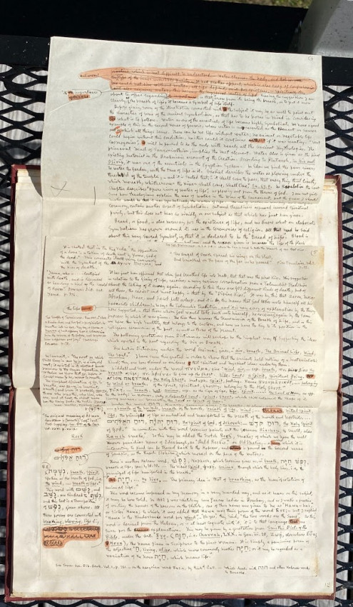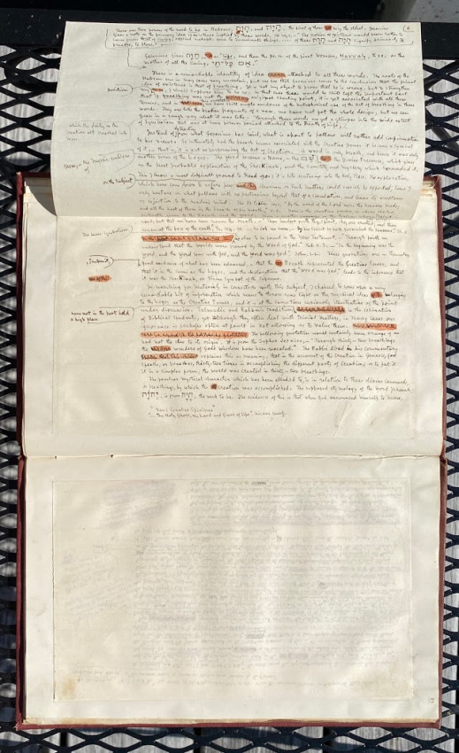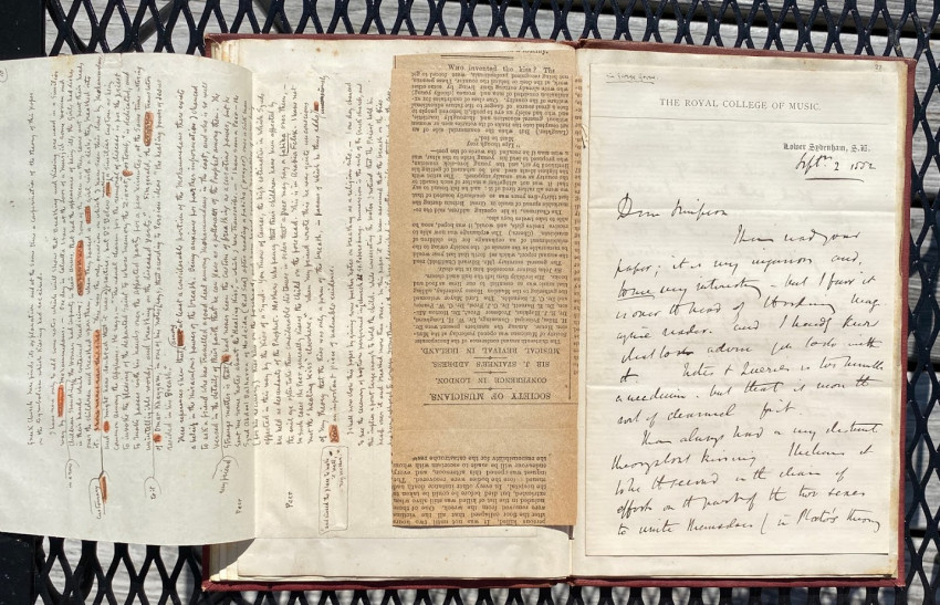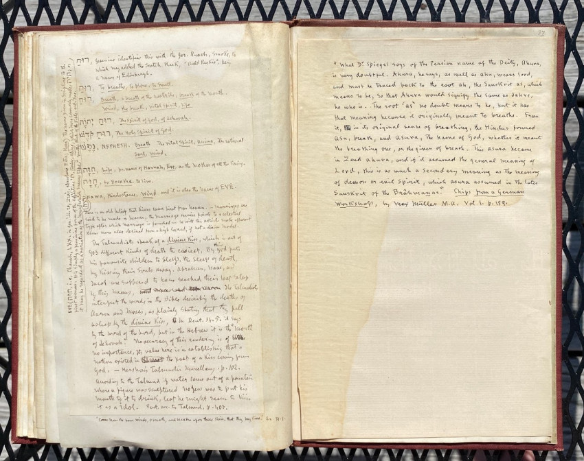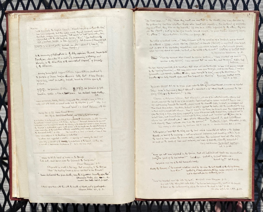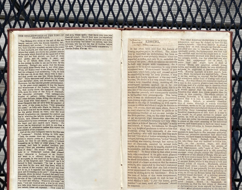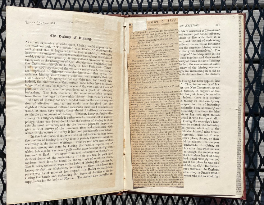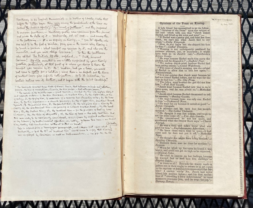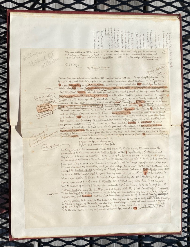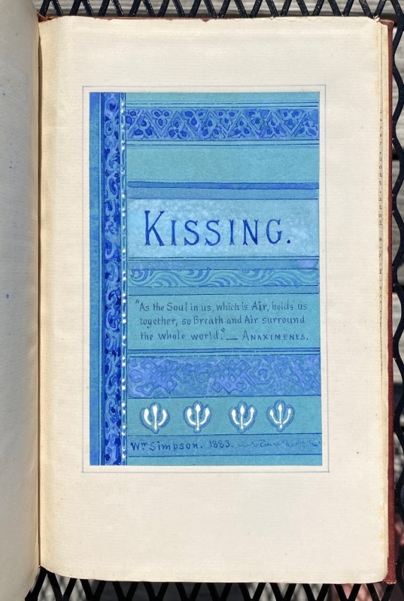 William SIMPSON (1823-1899), Sir George GROVE (1820-1890), Alfred H. 'Hajj' BROWNE, and others. "Kissing", an apparently unpublished manuscript and printed compilation by Simpson on the subject of kissing (in all its forms), with an original hand-painted gouache decorative ‘title’; other autograph manuscript contributions from Simpson, Grove, Browne and others; together with transcriptions of others work by Simpson, and printed extracts. [No place, but ?London]: [1882-]1883[-1887].