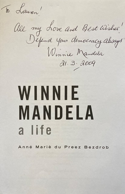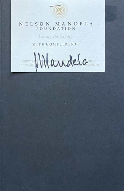 Signed & dated inscription from Winnie Mandela on title page. Compliments slip of the Nelson Mandela Foundation, bearing Nelson Mandela's signature, stapled to front free endpaper.