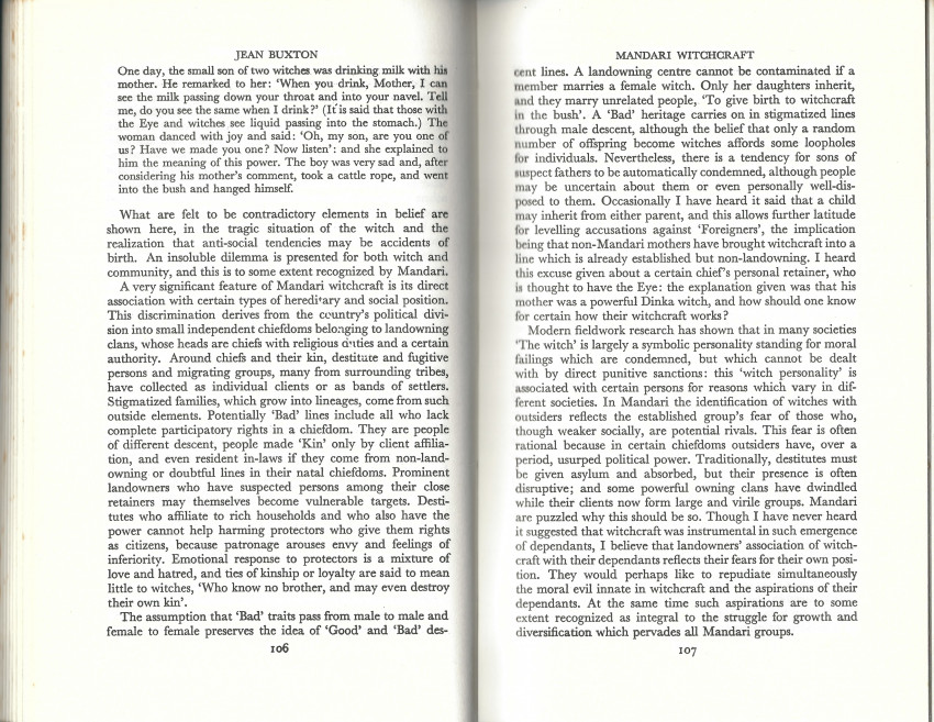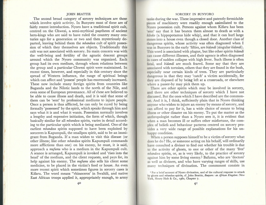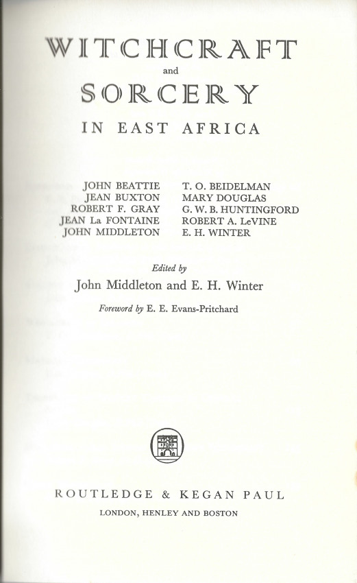Ethnographic accounts of magical beliefs and behavior. Containing ten essays by anthropologists on the beliefs and practices associated with witches and sorcerers in Eastern Africa, the chapters in this book are all based on field research and new information which is studied within its wider social context. Contents:1. John Beattie, Sorcery in Bunyoro 2. T.O. Beidelman, Witchcraft in Ukaguru 3. Jean Buxton, Mandari Witchcraft 4. Mary Douglas, Techniques of Sorcery Control in Central Africa 5. Robert F. Gray, Some Structural Aspects of Mbugwe Witchcraft 6. G.W.B. Huntingford, Nandi Witchcraft 7. Jean La Fontaine, Witchcraft in Bugisu 8. Robert A. LeVine Witchcraft and Sorcery in a Gusii community 9. John Middleton Witchcraft and Sorcery in Lugbara 10. E.H. Winter The Enemy Within: Amba Witchcraft .