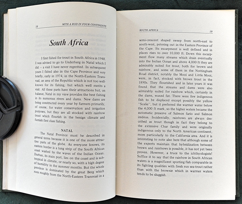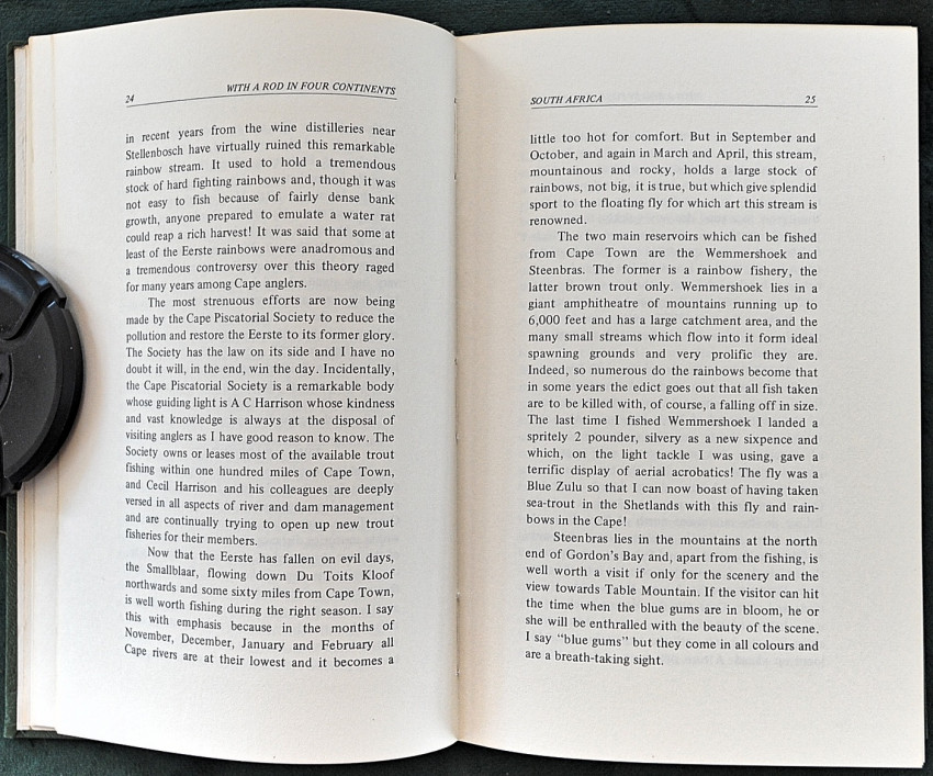 Iain Gunn first visited South Africa in 1948 where he spent some time fishing in the Underberg area in Natal. This memorable trip sparked many more angling trips to South Africa in the ensuing years spanning several months in total. He also spent a considerable amount of time in the Cape, staying with friends surrounded by vineyards on the slopes of Table Mountain in Constantia. He makes mention of all the major fisheries within 60 km from this base; Wemmershoek and Steenbras Dams, The Eerste River and the Smalblaar River, some of which he fished on a regular basis. He also makes kind mention of The Cape Piscatorial Society and A.C. Harrison who he found to be a most knowledgeable and helpful source of information on the local waters of the Cape.