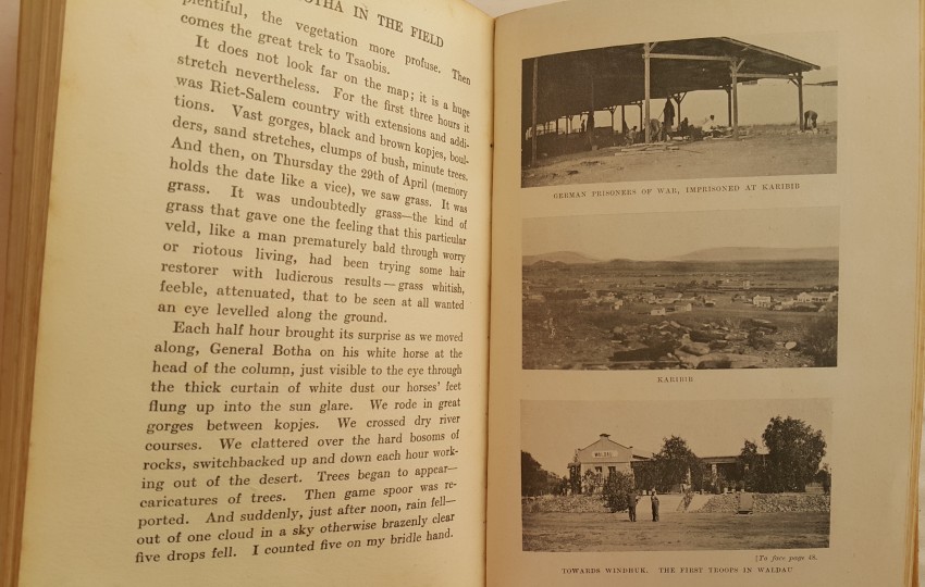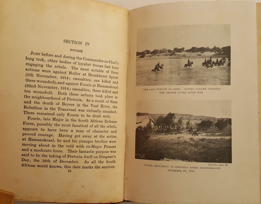 Insect damage to spine and some scattered light foxing. Only 68 pages, but has 5 diagrams and 82 photos mostly by the author. Part I deals with the Rebellion and Part II with the SWA Campaign. The leaf bearing an illustration of "Group of Rebel Leaders" facing p.8 and "Rebels rounded up after the capture of De Wet" facing p.9, has been expurgated.