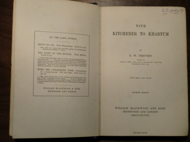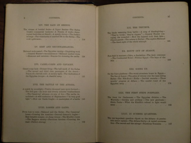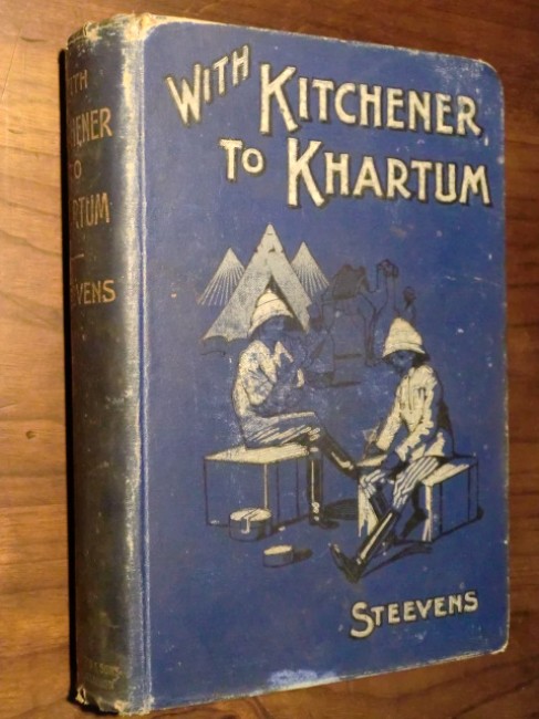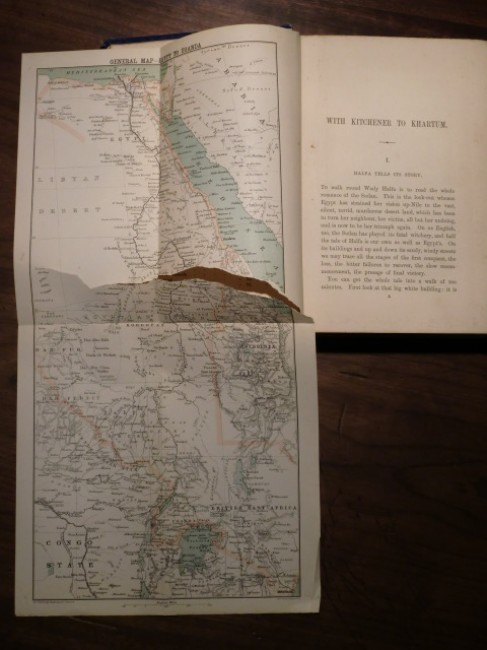 Sudan, with chapter headings such as: The Rise Of The Mahdi, The Egyptian Army, The S.M.R.(Sudan Military Railway), March To Berber, The Sirdar, In The British Camp, Fort Atbara, Kenur, The Raid On Shendi, The Battle Of The Atbara, The Desert March To Omdurman, The Battle Of Omdurman, etc... 326pp plus 32pp list of Blackwood publications; with 8 maps, some in full colour (fold-out). Book condition: blue pictorial boards are in a worn state, corners bumped, board edges and spine ends worn, inner end-paper hinges cracked; text very good (all pages and all maps present), some tears to maps, binding cracked in places.