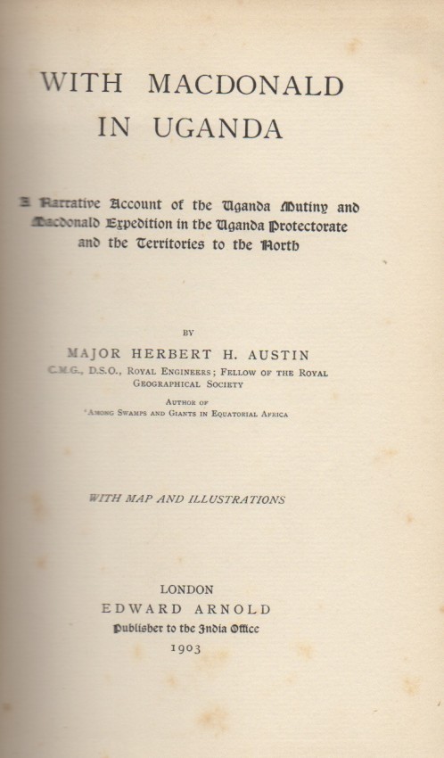 Austin accompanied the British military force sent to quell a mutiny among native troops in Uganda 1897. The column traveled through some of the richest game lands in East Africa, enjoying sport along the way. Lion was bagged on the Athi Plain, elephant near the Kiboko River, and gazelle and wildebeest near Lake Elmenteita. The bulk of the narrative describes the terrain of the region and the military campaign (Czech, p. 12).