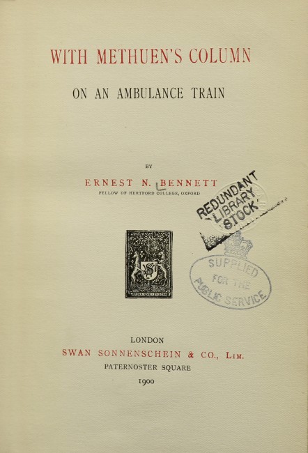 The photograph in Hackett (p 90) suggests that this (ex-library) copy of this rare book may have come from his collection. The summary from this source reads: "Narrative of a volunteer in the RAMC [Royal Army Medical Corps] engaged in transporting casualties from the front. The author relates incidents from the battles of Belmont, Graspan and Magersfontein, with reference to medical work in the field."