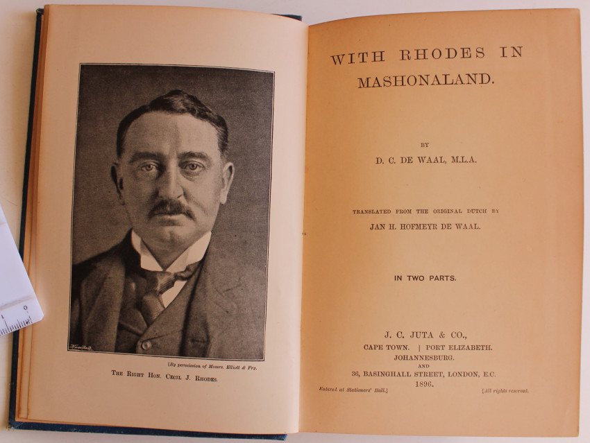 Original dark blue cloth boards with gilt titling on the spine. The rear cloth shows a white colouring. xix prelims, 351 pages, frontis portrait of Rhodes. Previous ownership on ffep. Translated from the original Dutch by Jan H. Hofmeyr de Waal.