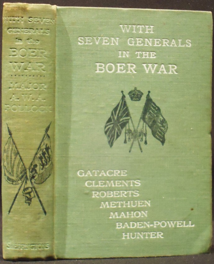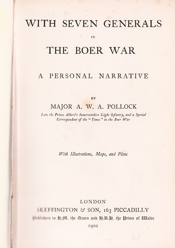 Mendelssohn (Sidney) South African Bibliography volume 2, page 172: 'An account of the author's experiences in the South African War under Generals Gatacre, Clements, Baden-Powell, Roberts, Methuen, Mahon and Hunter, between Ocotober 14, 1899 and July 20, 1900. Major Pollock was with the force that attempted to occupy Stormberg, part of which met with a grave defeat, and he took part in the relief of Mafeking and other operations'