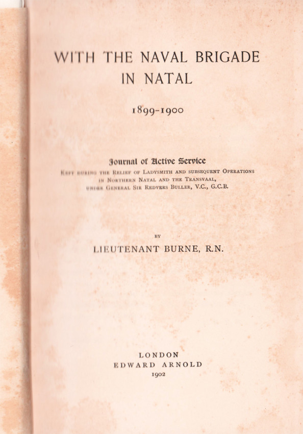 Hackett (R.G.) South African War Books page 52 :The diary of a gunnery officer during ten months service with the Naval Brigade in South Africa. Burne joined Gen Buller's force in Natal taking part in operations at Chieveley, Colenso, Spion Kop and Vaal Krantz between December 1899 and February 1890. Following the Relief of Ladysmith the naval detachment was broken up. The men of the H.M.S Powerful and H.M.S. Terrible being recalled for service elsewhere. Burne was taken ill with dysentry and sent to recuperate near Maritzberg. On return to service in April he was given command of a naval detachment in General Hildyards's brigade. The writer gives a personal account of the eastern advance with reference to the engagement ay Almonds nek in June 1900. Following a second bout of illness in July the author returned to his unit near Sandspruit in the Transvaal until recalled from active service in October 1900. The volume contains notes on field gunnery together with a diary of the war up to October 25 1900. Extracts from despatches and hints on clothing and equipment for active service appended.