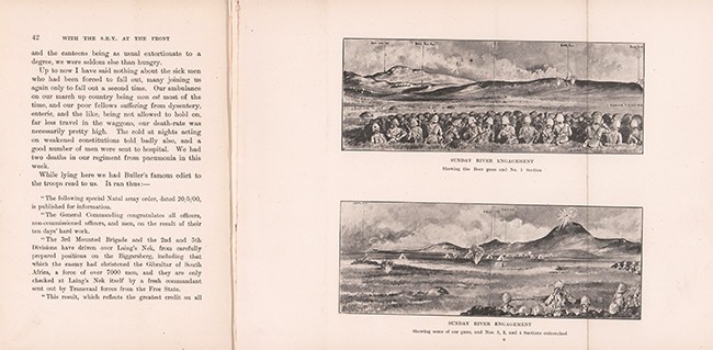 139 pages, frontispiece portrait, 35 illustrations - 2 folding, pictorial brown cloth gilt - the upper cover decorated with a sketch of Majuba.