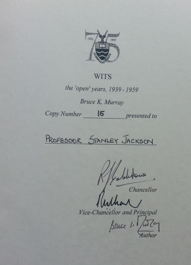 Limited deluxe edition, copy no. 15. Presented to Professor Stanley Jackson. Signed by the author, and Wits University’s Chancellor and Vice-Chancellor and Principal.